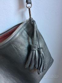 Borsa a tracolla in vera pelle color argento scuro, originale Pelletteria Veneta (Venezia), fodera interna in tessuto rosa, 3 scomparti più una tasca con zip e 2 taschine porta tessere. Tracolla regolabile o amovibile. Mai usata, priva di qualsiasi difetto, pari al nuovo. Dimensione cm 25 x 33 x 11