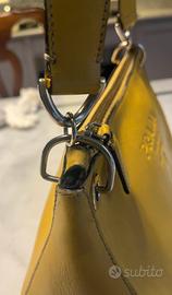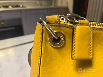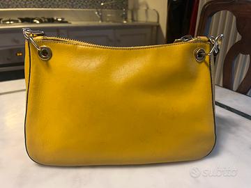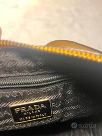 Borsa Prada in pelle gialla vintage, Made in Italy, originale, indossata frequentemente con vari segni d’usura, macchie e una piega sulla tracolla. Le cerniere (interna ed esterna) funzionano perfettamente e l’interno della borsa, foderato del tessuto iconico operato riportante logo Prada, è in ottime condizioni.
