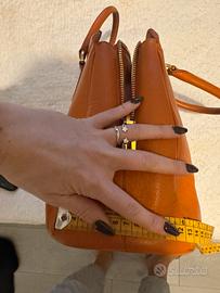 La fodera interna è nel classico tessuto Prada con logo jacquard tono su tono, in questo caso arancione (che corrisponde al colore esterno).