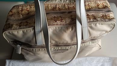 Borsa Prada in tessuto vela beige con inserto orientale a lato della cerniera di chiusura