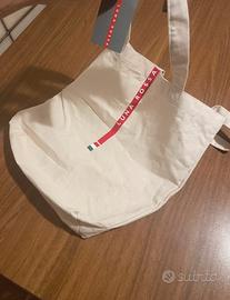 Borsa in tela beige con logo LUNA ROSSA e dettagli tricolore.
