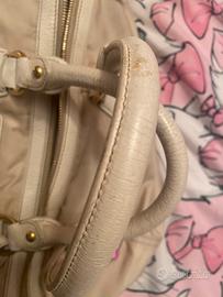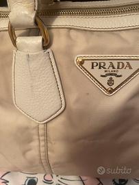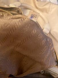 Borsa bauletto Prada originale in tela color crema e manici e riporti in pelle. Hardware dorato. Misure circa 40x30. All’interno tasca grande con cerniera. La borsa presenta due piccole macchie sul davanti e sui manici come evidenziato nelle foto e il prezzo ne tiene conto. Dentro e’ perfetta. Non ha la tracolla ma e’ predisposta per poterla mettere. Ritiro presso la mia abitazione di Milano zona CityLife.