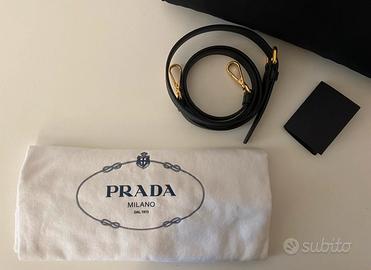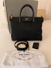 È realizzata in resistente tessuto nylon con il logo Prada e viene fornita con una chiusura a zip sicura, comodi manici in pelle è una sacca (sempre col logo Prada) per conservarla.
