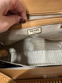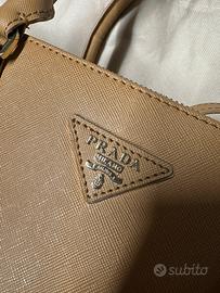 Iconica borsa Prada, colore beige chiaro, dal design elegante e minimal, perfetta per ogni occasione: lavoro, viaggi o uso quotidiano.