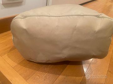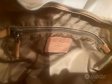 borsa Prada color sabbia, in tessuto tecnico con logo laterale e rifiniture in pelle. In ottime condizioni. l'unico difetto è evidenziato nell'ultima foto e si trova nella parte interna del manico, quello che poggia sulla spalla e quindi non si vede. Per il resto la borsa non ha macchie, graffi o evidenti segni di usura, né all'esterno. né all'interno
