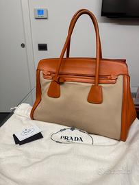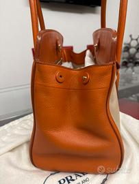 Borsa Tote Prada in pelle saffiano papaya e canapa. Completa di dust bag originale e certificato di autenticità. In ottime condizioni.