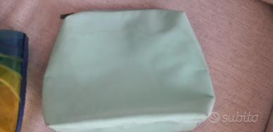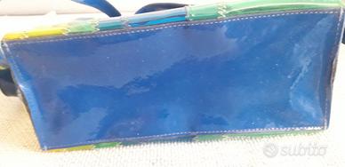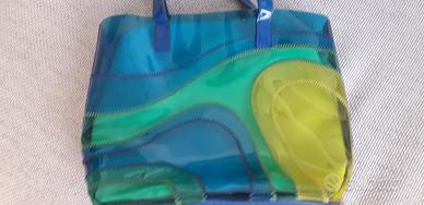 Borsa Braccialini formata da 2 elementi: borsa plastica colorata senza chiusura e busta tessuto con chiusura; colori che ricordano il mare; busta tinta unita; manico 42cm lungo; busta con qualche segno del tempo che pero' scompare lavandola Posso inviarla solo dal 13 aprile