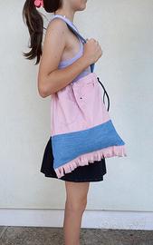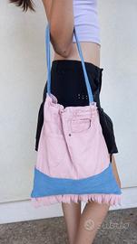 borsa fatta a mano con il riciclo di un denim e un pantalone in cotone.Chiusura con coulisse e fondo frangiato. In regalo un accessorio abbinato!!