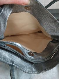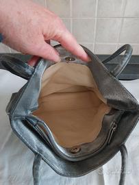 Borsa morbida di raso grigio. 1 tasca interna con cerniera. Interno stoffa impermeabile. Misure. Lunghezza totale compresa di manici 57 cm. Lunghezza manici 32 cm. Larghezza borsa 34 cm. Profondità 7 cm. Nuova, mai usata, solo un po’ spiegazzata per averla tenuta nel guardaroba anzichè appesa. (n. 3133)