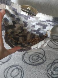 Borsa realizzata a mano con la rete Canvas, con filato morbido multicolore sui toni del beje, marrone e bianco. Impreziosita da chiusure e catena dorate. Molto morbida e perfetta come pochette da giorno.