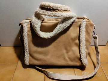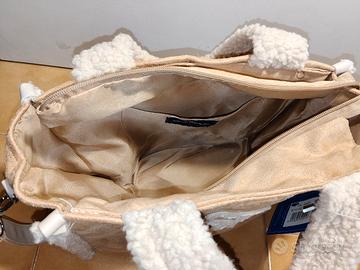 Borsa di Renato Balestra. Larga 30 cm, alta 20 cm, profonda 14 cm. Colore beige con decorazioni di lana bianca. Con tracolla rimovibile e manici. Confezione originale non presente, ma ha ancora il cartellino attaccato.