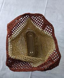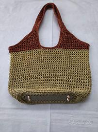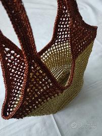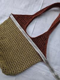 Borsa a rete fatta a mano ad uncinetto in cordino lurex nei colori oro e rame. Fondo in ecopelle con piedini. Morbida e capiente, può essere portata a spalla e a mano. Misure in foto.