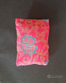 Fantasia multicolor, fucsia con trama a fiori e figure geometriche in blu, verde e beige. Facilmente richiudibile fino a diventare tascabile.