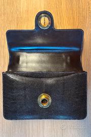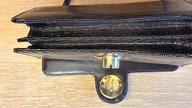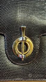 Borsa artigianale da donna marrone scuro di Cellerini con fibbia dorata. Made in Florence by Cellerini, anni 60/70. 100% pelle Made in Italy con pelle stampata dark brown effetto lucertola e inserti dorati. Dimensioni: 25 x 16 x 4,5 cm (larghezza,altezza,profondità). Borsa con chiusura a pattina con gancio orientabile. Interno con 3 scomparti, scomparto centrale con chiusura a zip • 3 tasche di cortesia, una con chiusura a zip PARTI METALLICHE • Accessori in metallo colore oro.