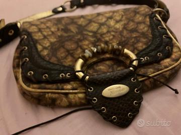 Borsa Roberto Cavalli Freedom Vintage - Stampa Pineapple & Snake - Y2K Icon Descrizione Splendida borsa a spalla firmata Roberto Cavalli, appartenente alla celebre linea Freedom dei primi anni 2000. Un pezzo da collezione che incarna perfettamente l'estetica glamour e audace del designer italiano. Dettagli del design: Fantasia: Un mix unico di stampa "pineapple" (ananas) nei toni del giallo e del bronzo, abbinata a profili in pelle stampa serpente marrone scuro. Hardware: Spicca l’iconico anello centrale in metallo dorato, decorato con pietre dure/cabochon incastonati che fungono da chiusura ornamentale. Tracolla: Regolabile e bicolore (esternamente stampa rettile, internamente oro metallizzato), perfetta per un look versatile. Dettagli artigianali: Bordature con intrecci in pelle e borchiette dorate che seguono la silhouette della borsa. Interno: Fodera logata con la scritta "Freedom" (tipica del periodo) e tasca interna con zip. Condizioni: Stato: Ottime condizioni vintage. La stampa è vivida e i profili in pelle sono ben conservati (osservare bene le foto per piccoli segni di usura naturali per l'età). Accessori inclusi: Completa di sua dustbag originale con stampa animalier e logo Roberto Cavalli Freedom. Perché acquistarla: È un accessorio simbolo dell'era Y2K, ideale per chi ama il vintage di lusso e i pezzi "statement" che non passano inosservati. Perfetta sia per outfit casual che per serate speciali.