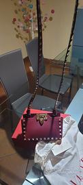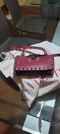 Borsa Rockstud con tracolla regolabile può essere indossata a spalla oppure a tracolla colore rosso bordeaux 100% pelle di vitello dimensioni: 17 cm L 11 cm H 3 cm Profondità nuova con cartellino attaccato e scatola rossa