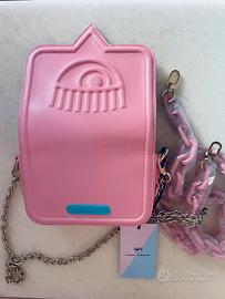 Borsa tracolla, con la canena di metallo dorato e la catena di plastica rosa.