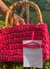 Vendo NUOVA ancora col cartellino, mai usata! Borsa chiamata "Meteora" dall'azienda, fatta a mano in Italia, marca Chica Handmade, forma a scatola, misura piccola, realizzata all'uncinetto con manici in bambù e pochette interna in tessuto. Presenta anche un inserto dorato per riuscire a portarla a tracolla.