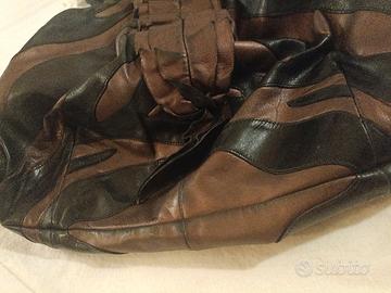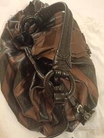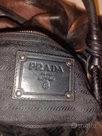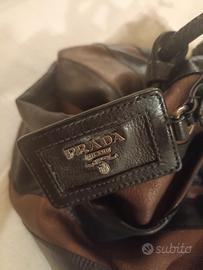 borsa vintage Prada. Ha un corpo in pelle arruffato e manici arrotolati . misure32x31x16. I colori sono il nero e marrone bronzo. Ciondolo distintivo della maison . Borsa in eccellenti condizioni di second hand