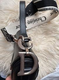 Vendo la mia classica borsa Saddle con finiture in argento anticato. La morbida pelle di capra nera e la tracolla in tela bianca e nera creano una combinazione straordinaria.