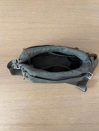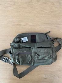 Borsa a tracolla Samsonite da donna in tessuto di nylon di colore verde oliva, apertura tasca principale con cerniera, 3 tasche frontali, 1 posteriore e 2 tasche laterali tutte con cerniera, tracolla regolabile. Ideale per ogni occasione elegante e pratica, multitasche, leggera e lavabile, organizer interno Logo Samsonite frontale