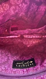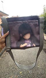 La borsa presenta l’illustrazione iconica della bambolina Gorjuss sul lato frontale, con colori predominanti viola e nero. Realizzata in tessuto resistente con inserti in stoffa, è dotata di una chiusura superiore con zip. L’interno è completamente foderato con tessuto decorato a tema Gorjuss e dispone di una tasca con zip e due tasche aperte. In ottime condizioni mai usata. Ideale per uso quotidiano, scuola, lavoro o per collezionisti del marchio.