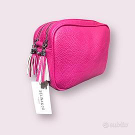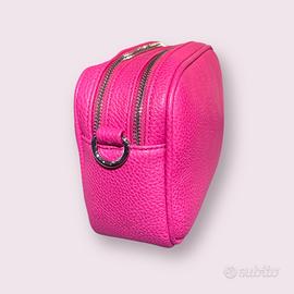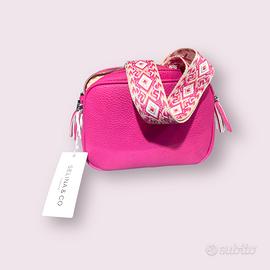 Borsa realizzata in semil pelle rosa, questa borsetta ha una doppia chiusura a cerniera impreziosita da nappine… tracolla larga in tessuto regolabile