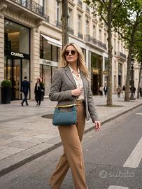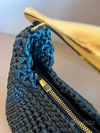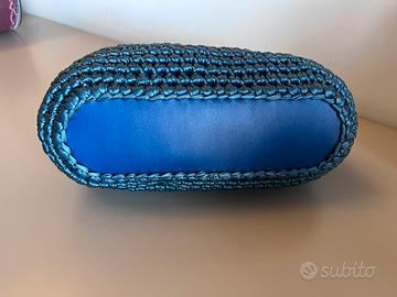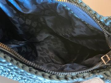 Borsa realizzata a mano ad uncinetto con filato in similpelle di color ottanio. Fondo tigido in similpelle. Chiusura con cerniera. Foderata. Dotata di dust bag.