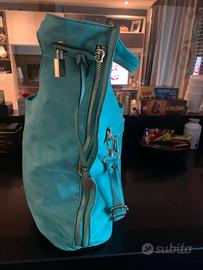 Borsa scamosciata colore verde tiffany - la borsa puo’ essere a mano o a tracolla - Ha una tasca esterna sul retro con cerniera. 4 rasche interne di cui 2 con cerniera. Dunrnsioni h. 44 cm, larghezza 45 cm. Il fondo della borsa e’ largo 15 cm.
