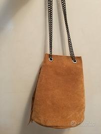 Borsa a tracolla formato secchiello in morbida e vera pelle scamosciata, made in Italy. Design unico arricchito da lunghe frange, di tendenza. Bellissimo colore tabacco . Dimensioni: 24x 20x 20 cm Materiale esterno : vera pelle scamosciata Materiale interno: fodera nylon antistrappo Chiusura a bottone magnetico. Tracolla con catenella di metallo Una tasca interna con zip Borsa casual e versatile per ogni occasione. in ottimo stato e ben conservata , vendo a 17 euro .