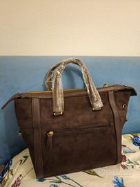 Borsa scamosciata marrone scuro, marchio Carpisa. Mai utilizzata, con cartellino e imballaggi di protezione originali. Ottime condizioni. Ha una cinghia lunga all'interno utilizzabile all'occorenza. È dotata di una tasca esterna con chiusura con zip e, internamente, di una tasca chiudibile con una zip e due piccoline che rimangono aperte. Dimensioni 28,5x26,5x13 cm. Etichetta interna per la composizione in foto. Prezzo trattabile 😊