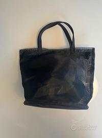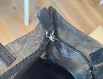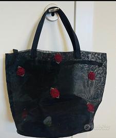Elegante secchiello in tulle nero con roselline in trasparenza rosse, chiusura con zip, base piu rigida e foderata, 2 manici. Dimensioni: base cm 20x cm 14, altezza cm 2”. Indossato 2 volte in occasione di cerimonia, perfetto ed integro.