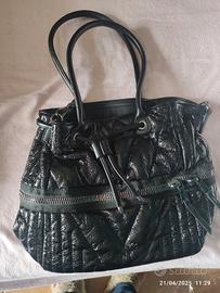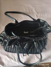 Borsa secchiello nera lucida, con manici e tracolla staccabile, fondo rigido, media grandezza con diversi particolari sul davanti, come nuova usata due volte, prezzo trattabile
