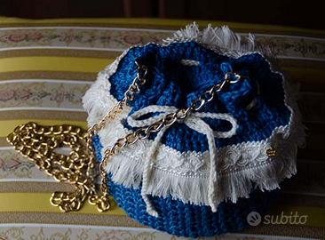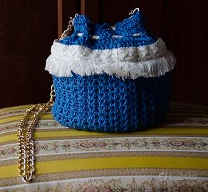 Borsa secchiello in cotone 100% ,nei colori blu/bianco, fatta a mano con rivestimento interno in stoffa fantasia siciliana. Ornata esternamene con frangia bianca. Chiusura con cordoncino. Tracolla catenella in metallo oro. Articolo di artigianato.