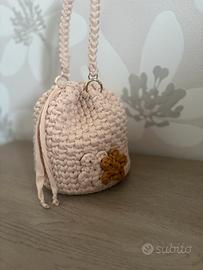 Realizzata a mano in fettuccia di lycra veige con fiori all’uncinetto