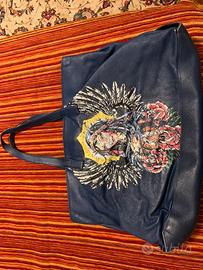 Borsa Secret Pon Pon, azzurra, in vera pelle, molto capiente da portare a spalla o a mano. Angoli un po’ usurati ma ancora molto bella, con pittura su entrambi i lati.