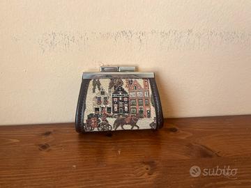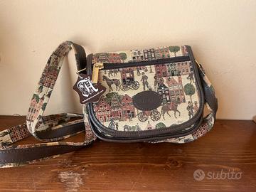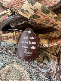 Elegante set coordinato della "Arthur Collection" composto da 3 pezzi in pregiato arazzo stile Gobelin e rifiniture in vera pelle marrone (come da etichetta originale inclusa). Il set comprende: -Borsa a tracolla: Raffinata scena architettonica fiamminga (stile Bruges) con carrozze e cavalli. Chiusura a zip e logo in rilievo. -Portamonete coordinato: Tipica chiusura "a bacio" (kiss-lock) in metallo dorato, stile vintage. -Custodia multiuso: Decoro con gatto tigrato, ideale come porta occhiali o porta cellulare. Condizioni eccellenti, oggetto mai stato utilizzato, con etichetta. Tessuto jacquard intatto e pelle morbida. Prezzo trattabile! :)