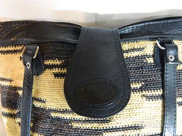 Borsetta bucket “Shigra” a secchiello originaria dall’Ecuador; esterno in sisal (fibra di agave), manici e particolari in pelle nera, tessuta a mano; colore nero, marrone e giallo paglia; chiusura a cerniera zip e pattina con bottone magnetico, uno scomparto grande interno più una tasca a zip. Usata in buone condizioni. Dimensioni (LxPxA): 22 x 22 x 27 cm circa. Creata da artigiani di Otavalo nella ande in Ecuador. Ideale per stagione estiva e spiaggia. Molto rara in Italia.