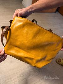 bellissima borsa shopper color senape/giallo caldo, effetto pelle morbida. Capiente e perfetta per uso quotidiano, lavoro o università. Dotata di: •doppi manici marroni per portarla a spalla •tracolla regolabile e removibile (ancora confezionata) •chiusura con bottone magnetico •pochette interna con zip, agganciata ma removibile •tasche interne per organizzare al meglio gli spazi Condizioni: mai usata / come nuova (vedi foto, ancora con parti protette) Misure indicative: grande e capiente (entra facilmente PC, documenti, per qualsiasi domanda scrivimi 😊