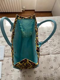 Borsa shopper cm 42x36 esterno tessuto di cotone disegno leopardato in ottime condizioni, interno con fodera in tessuto sintetico di colore azzurro con presenza di aloni giallognoli sul fondo e sul retro retro.Maniglie e profili laterali in ecopelle azzurra. Usata poche volte.