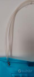 In plastica azzurra, blu con manici in plastica trasparente.