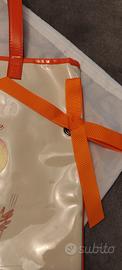 borsa shopper in materiale plastico con frase umoristica.color panna con manici,bordi e fiocchi arancioni.