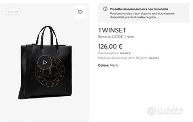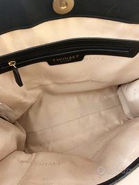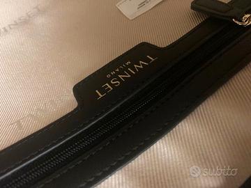 Borsa capiente, elegante e con un tocco rock-chic grazie alle borchie dorate. È perfetta per il tempo libero ma anche per il lavoro perché può comodamente contenere i formati A4. - Modello: Shopper/Tote Twinset 212TD8111 - Colore: Nero - Materiale: Ecopelle martellata - Dettagli: Logo "Oval T" iconico formato da borchie metalliche color oro sul davanti - Dotata di doppio manico superiore e tracolla amovibile - Dimensioni: 34 x 38 x 10 cm (Larghezza x Altezza x Profondità) - Manici: 14 cm - Chiusura con clip magnetica - Interno Spazioso e organizzato con 1 tasca con cerniera e 1 tasca piatta Presenta piccoli segni negli angoli in cui l’ecopelle è leggermente lisa, ma le cuciture, la fodera interna e la cerniera della tasca interna sono perfette. Prezzo Originale: € 196,00 (visibile nell'ultima immagine presa dal sito Escarpe) Disponibile a fornire altre fotografie. Il prezzo è trattabile se l'offerta è congrua e la trattativa è rapida.
