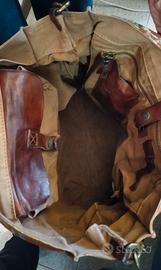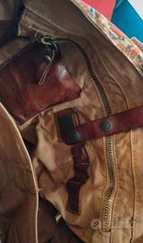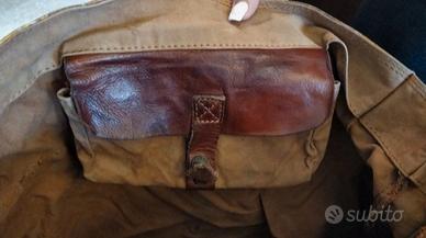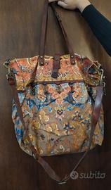 La shopping bag Genziana è il modello iconico della collezione Campomaggi, realizzata con una base in canvas beige o blu e stampata con i nuovi colori di stagione. Realizzato in canvas con stampa Teodorano e pelle di vacchetta Chiusura con bottone a pressione Finitura accessori in oro Taschino interno con zip Taschino porta cellulare Porta penne Manici, altezza 25cm Tracolla regolabile e removibile. Dimensioni della sacca: Altezza 40cm, Larghezza 35. Utilizzata pochissime volte.