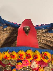 Bellissima borsa tradizionale siciliana detta “coffa”. Realizzata interamente a mano, in paglia nana, con manici rivestiti, chiusura con tipico campanellino, specchietti applicati e pin pon (giummi), multicolore, estremamente fashion!