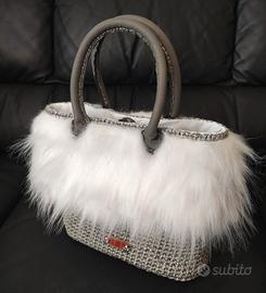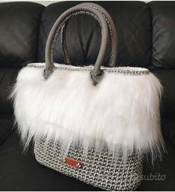 Borsa fatta a mano con cordino silver, pelliccia sintetica bianca, foderata con taschino, chiusura magnetica e manici handmade in vera pelle