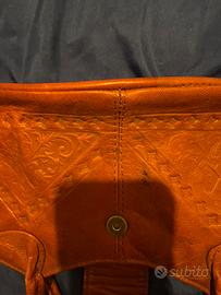 Bellissima borsa vintage originale made in Tunisia, realizzata in vera pelle di un caldo color cuoio/cognac. Un pezzo unico dal fascino artigianale e boho-chic. L'articolo presenta splendide lavorazioni a rilievo (embossing) con motivi floreali e geometrici tipici della tradizione artigianale tunisina. La pelle presenta una bellissima patina naturale che ne attesta l'autenticità. Come mostrato nelle foto di dettaglio, sono presenti alcune piccole macchiette sulla pelle: si prega di notare che non ho fatto alcun tentativo di pulirle o rimuoverle per non rischiare di alterare la pelle. Per il resto, non ci sono difetti strutturali e gli interni sono puliti.