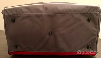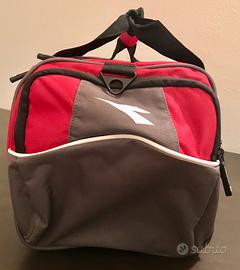 Borsa sportiva NUOVA, MAI USATA Diadora col. rosso - marrone, con manici e tracolla neri, 1 tasca frontale, tasche su entrambi i lati, apertura con cerniera a doppio cursore sulla parte superiore (cursori con occhiello per lucchetto), tracolla staccabile con cuscinetto comfort spalla, fondo rigido, tacchetti nella parte sotto.