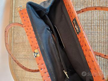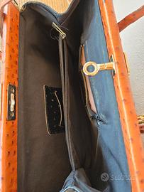 Borsa a mano rigida. Fabbricazione artigianale con stampa a struzzo, con chiusura superiore a incastro in metallo dorato. Doppi manici e tracolla. Bicolore nero e miele