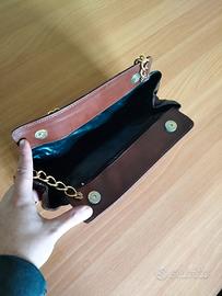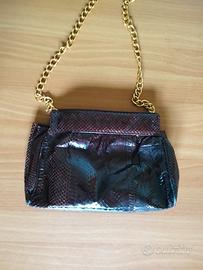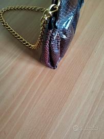 borsa a mano da donna, con finitura stampa rettile color marrone scuro e tracolla a catena color oro, praticamente nuova come visibile in foto